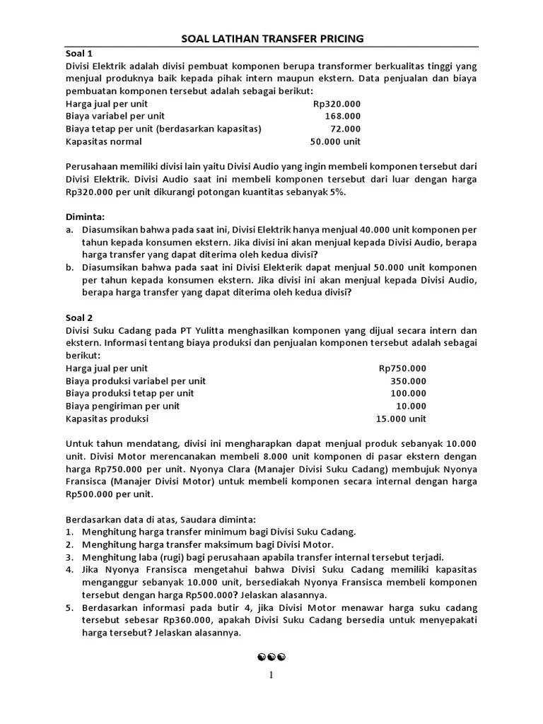 Contoh Harga Transfer / Transfer Pricing Especially In Indonesia Aditya Wijaya Academia Edu / Penelitian ini menggunakan pendekatan deskriptif kuantitatif, sedangkan metode yang digunakan memakai pendekatan metode harga transfer berdasarkan biaya penuh, .. Penentuan harga transfer (transfer pricing). Pt persada memiliki dua pusat laba yaitu . Contoh soal menerima atau menolak pesanan khusus. Divisi suku cadang pada pt yulitta. Sebagai contoh, pembebanan harga transfer yang rendah untuk anak .